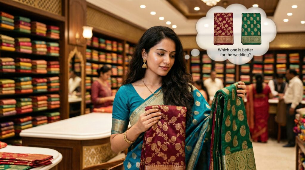 However, buying the perfect Banarasi saree is not always easy. With so many fabrics, patterns, colors, and price ranges available, it is common to feel confused. Sometimes, a saree may look stunning in the store but may not feel right when you actually wear it. This is where most people make mistakes and later regret their purchase.